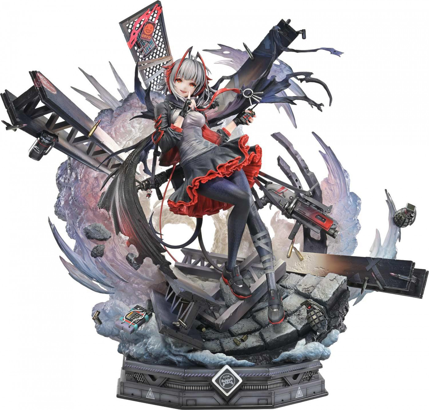 爆発により破壊されたステージの渦中で、いたずらな微笑みを浮かべるサルカズの榴弾射手・W。彼女の本質を表すかのような昇進2のビジュアルが、1/6スケールで表現された1体です。印象的な円形構図と浮遊感あるポージングを、立体ならではの奥行きあるレイアウトで演出。爆発を支配する者の存在感を際立たせました。