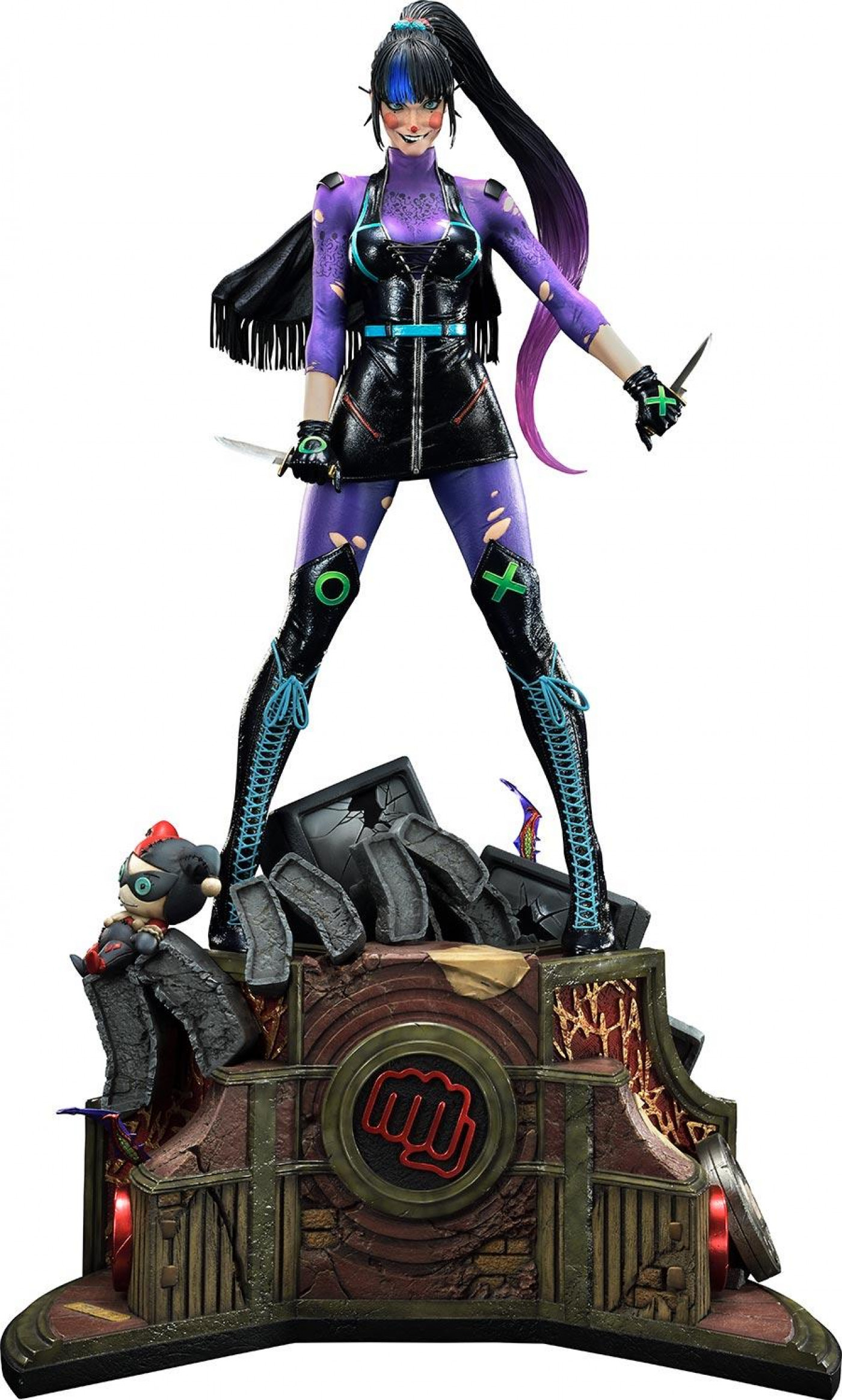 そして世界観を感じさせる様々な要素が散りばめられたベース部にも注目。パンチラインを象徴する拳のマークを中心に、瓦礫やフィルム缶ケース、山積みになったブラウン管テレビなどなど、ストーリーを感じさせるほどの細部への拘りには思わず引き込まれてしまうほど…。そして傍らには先代とも言えるハーレイのぬいぐるみが。どこかで見たことがあるようなこのぬいぐるみ…ヒメネス氏の粋な計らいも忠実に造形化しています!