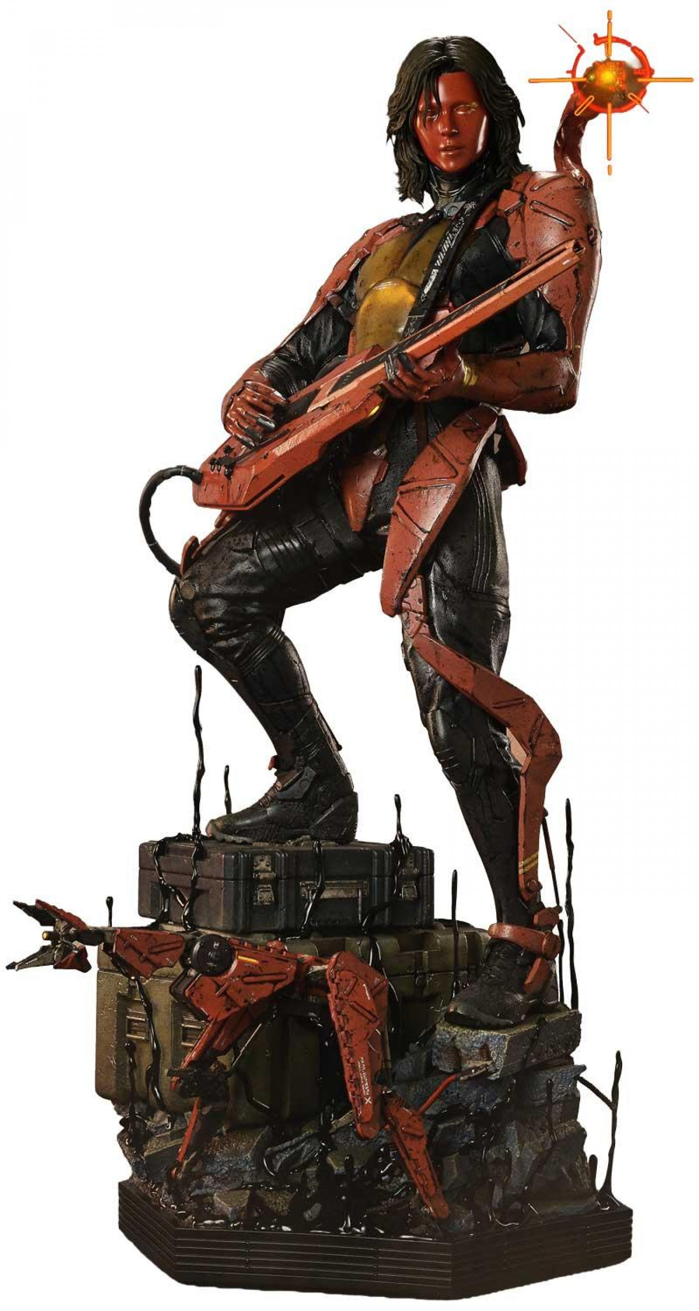 嘲るような表情は、トロイ・ベイカーの顔立ちを子細に分析して製作。ムラのある白塗り、涙のようなラインも生々しく彩色しました。ゴーストメックの身体も、独特な赤の色合いや汚しの分量まで追求。LEDユニットにより、オドラデクと腹部が作中同様の光を放ちます。タールが湧き立つ特製ベースは、ゲームの世界観を映し出したもの。積み重ねた荷物、付き従うドッグマインも精巧な出来栄えです。