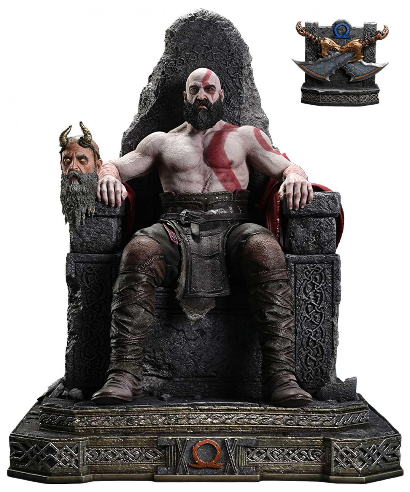 深い皺と豊かな髭を備えた顔立ちは、人生の機微に通じた戦士の威厳が漂うもの。無数の古傷が刻まれた肌も、荒れた質感や深い陰影を丹念に彩色しました。身にまとう革と鉄の装備や、岩の玉座に刻まれた文様は、北欧神話の無骨な世界観を表しています。また肘掛に鎮座する盟友のミーミルも、カールした髭までリアルな出来栄えです。内蔵LEDにより灯る両目の光が、クレイトスの見据える先を照らします。