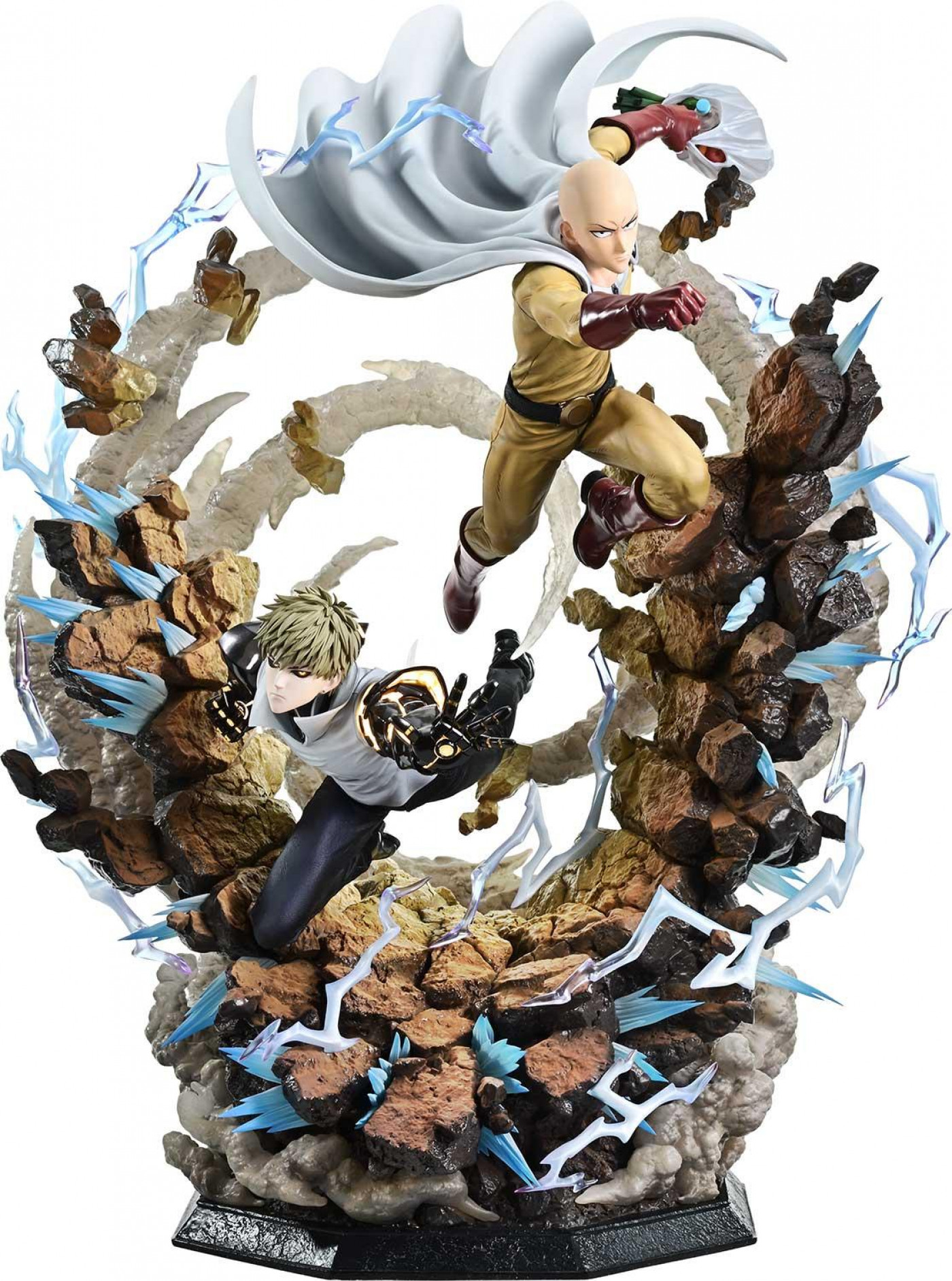かつてない強敵に立ち向かい、それぞれの必殺技を放つサイタマとジェノス。誰もが思い描く胸熱の共闘シーンを、1/4スケールで立体化したスタチューです。マジ殴りと焼却砲を同時に繰り出すポージングは一体感あふれるもの。砕け散る岩塊、渦を巻く粉塵、空間を走るエフェクトも、ふたりの力とスピードを物語ります。
